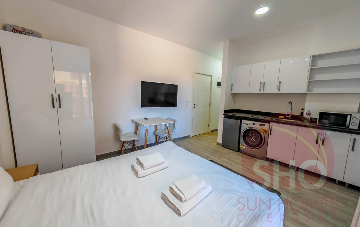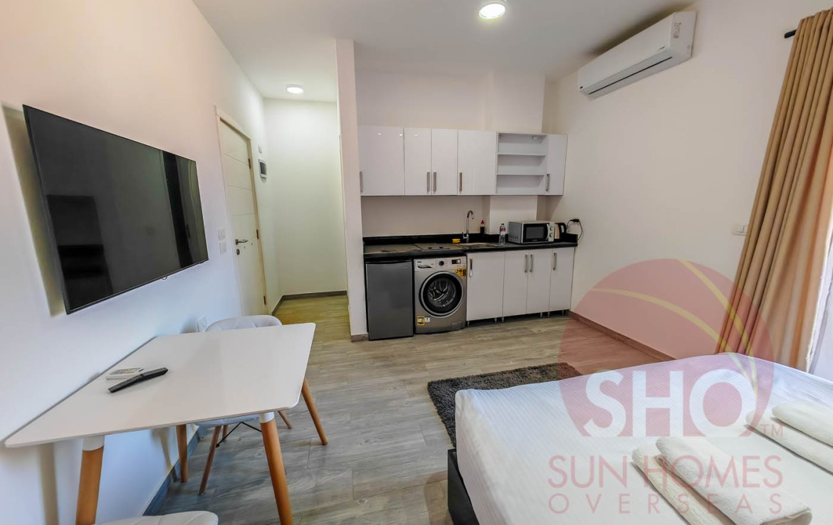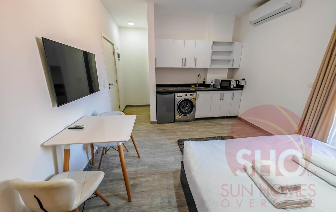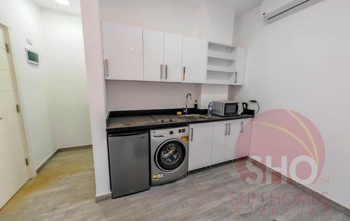 Wir präsentieren zum Verkauf ein geräumiges und eingerichtetes Studio in einem hochwertigen Studio im Imperial Resort. Dieses offene Studio im zweiten Stock verfügt über ein vollwertiges Bett mit Nachttisch, zweitüriger Kleiderschrank, Esstisch und zwei Stühle sowie eine voll ausgestattete Küche mit weiß glänzender und schwarzer Marmorarbeitsplatte mit Kühlschrank, Waschmaschine und eingebautem Herd. Das Badezimmer ist luxuriös gefliest und hat eine Duschkabine. Der Balkon mit Glasbalustraden überblickt das Schwimmbecken.