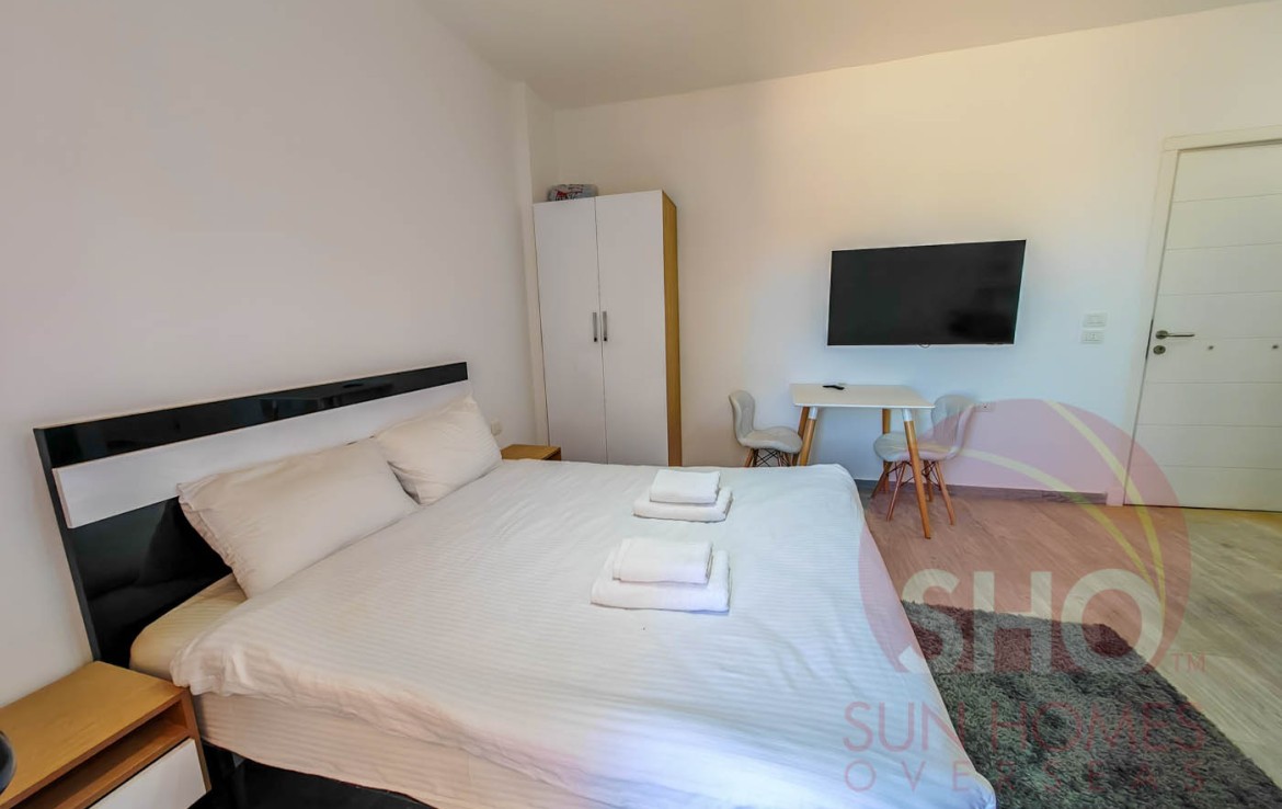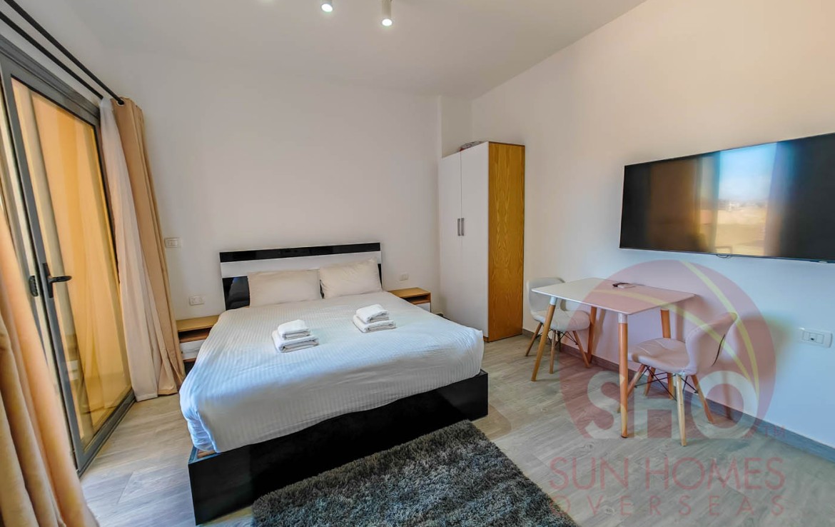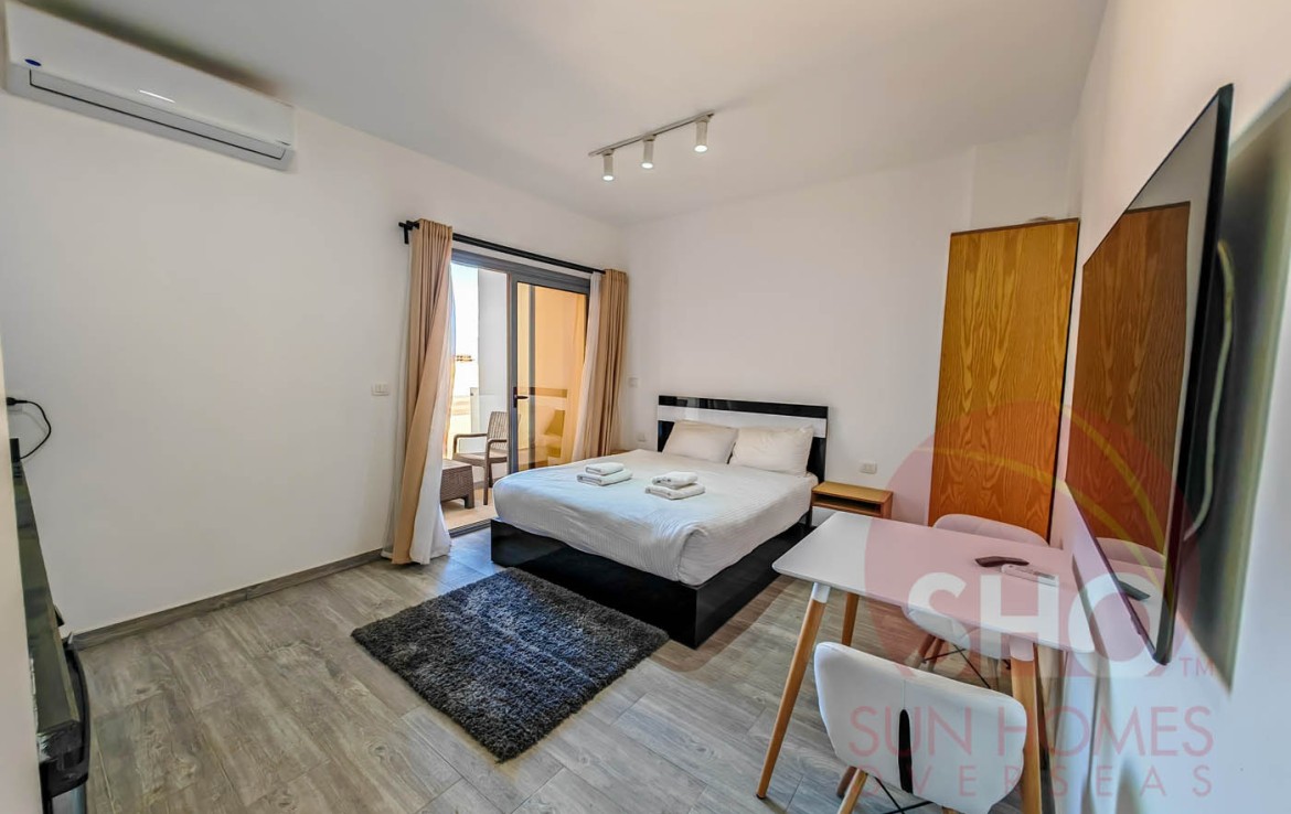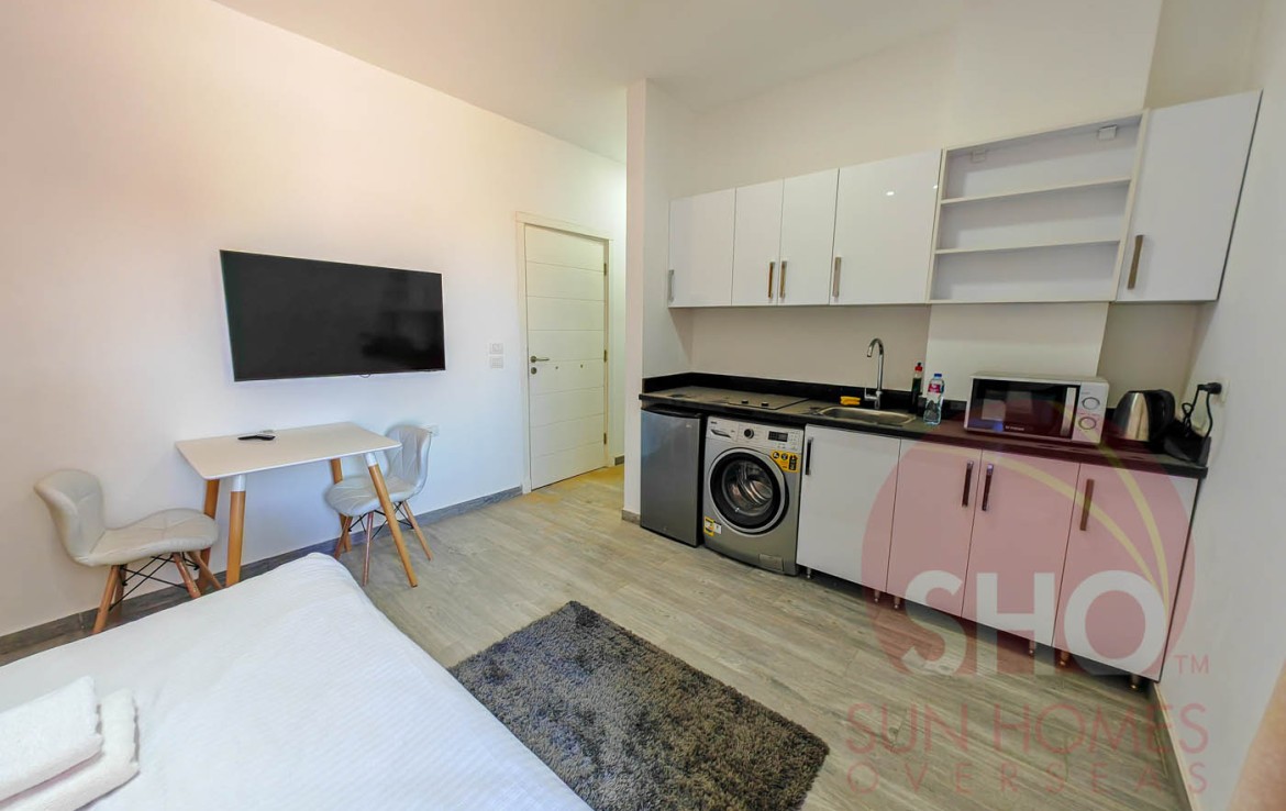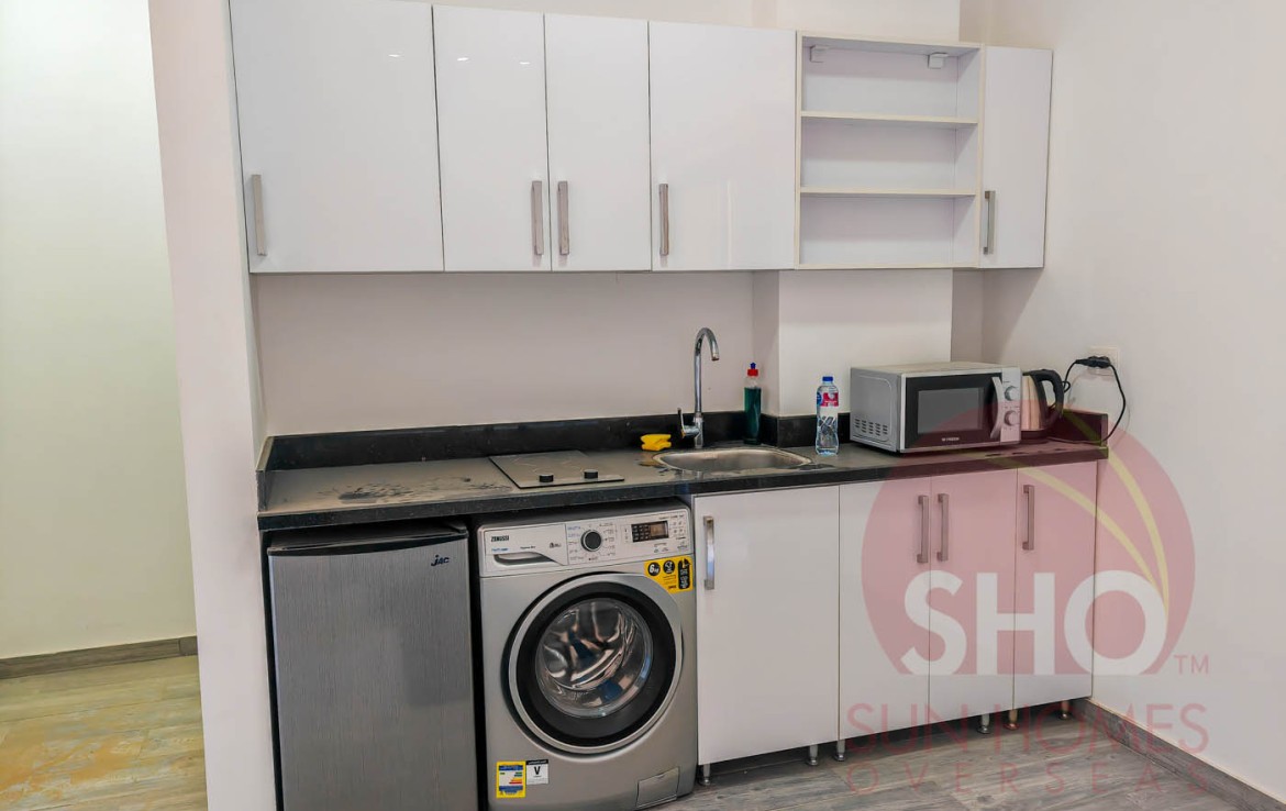 Wir präsentieren zum Verkauf ein geräumiges und eingerichtetes Studio in einem hochwertigen Studio im Imperial Resort. Dieses offene Studio im zweiten Stock verfügt über ein vollwertiges Bett mit Nachttisch, zweitüriger Kleiderschrank, Esstisch und zwei Stühle sowie eine voll ausgestattete Küche mit weiß glänzender und schwarzer Marmorarbeitsplatte mit Kühlschrank, Waschmaschine und eingebautem Herd. Das Badezimmer ist luxuriös gefliest und hat eine Duschkabine. Der Balkon mit Glasbalustraden überblickt das Schwimmbecken.