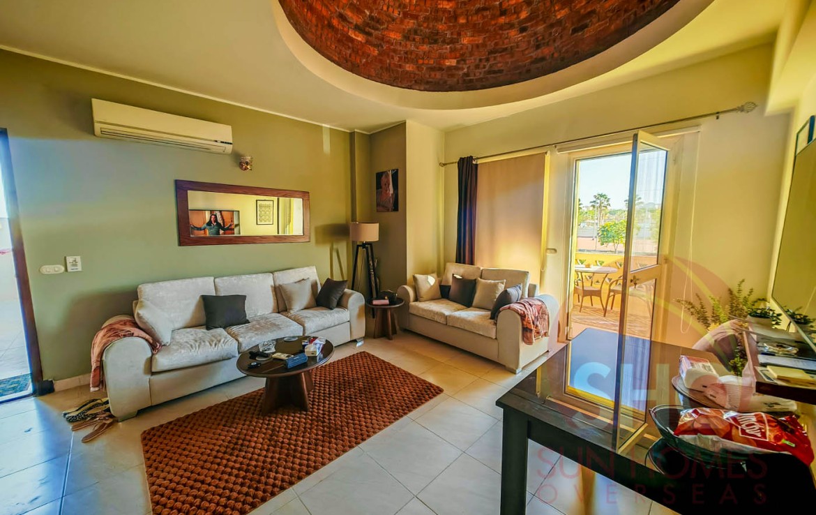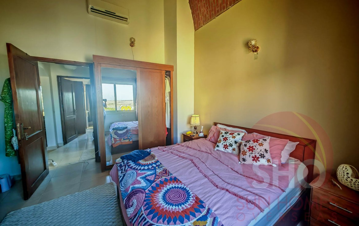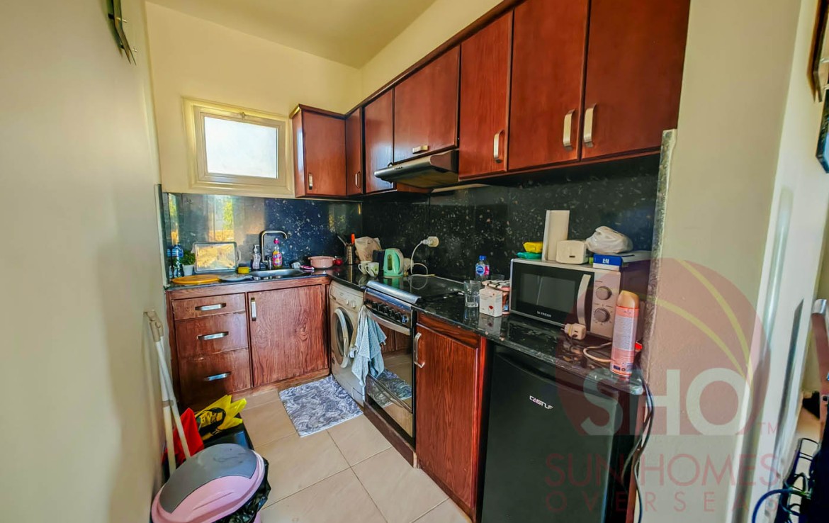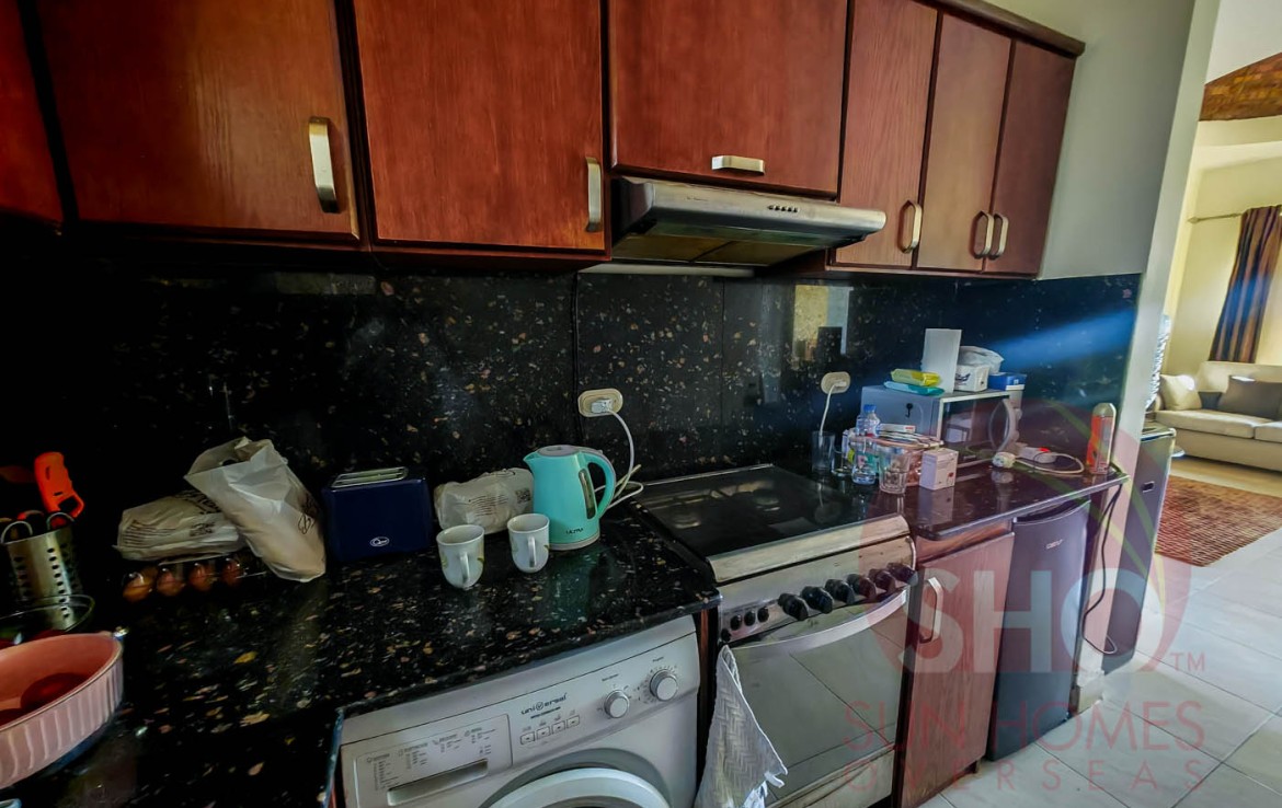 Presenting for sale a spacious second floor fully furnished 2 bedroom apartment on a T9 block in Makadi Heights which has its own private swimming pool. This property is sold fully furnished and includes a spacious living area with 3 + 2 seater sofas’ coffee table, wall mounted Smart TV. There is a separate kitchen area with solid wood units and black granite worktops, gas oven & hob, washing machine, fridge . There are 2 double bedrooms, both of which are spacious in size. One has a double bed and wardrobes while the second has 2 single beds and wardrobes as well as bedside tables. The bathroom is fully tiled with toilet, sink and shower cabin while the balcony has a quiet and sunny outlook. The property is in a prime location within Makadi Heights, overlooking the clubhouse and next door to the public pool.