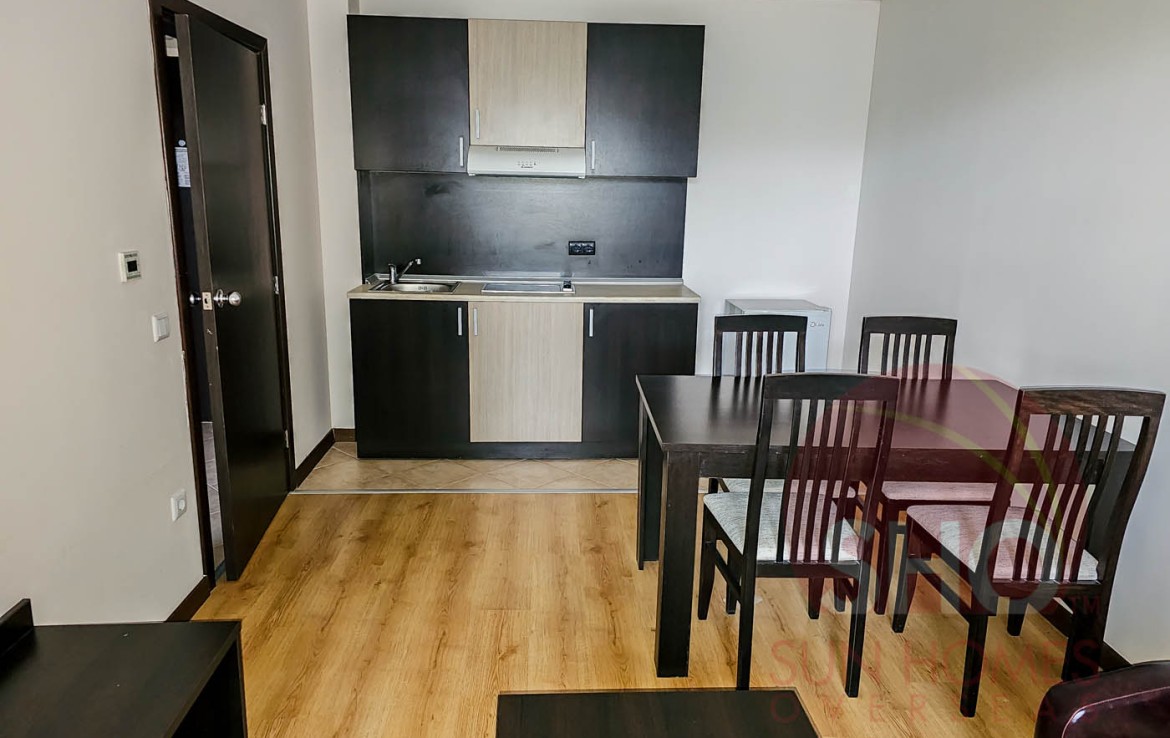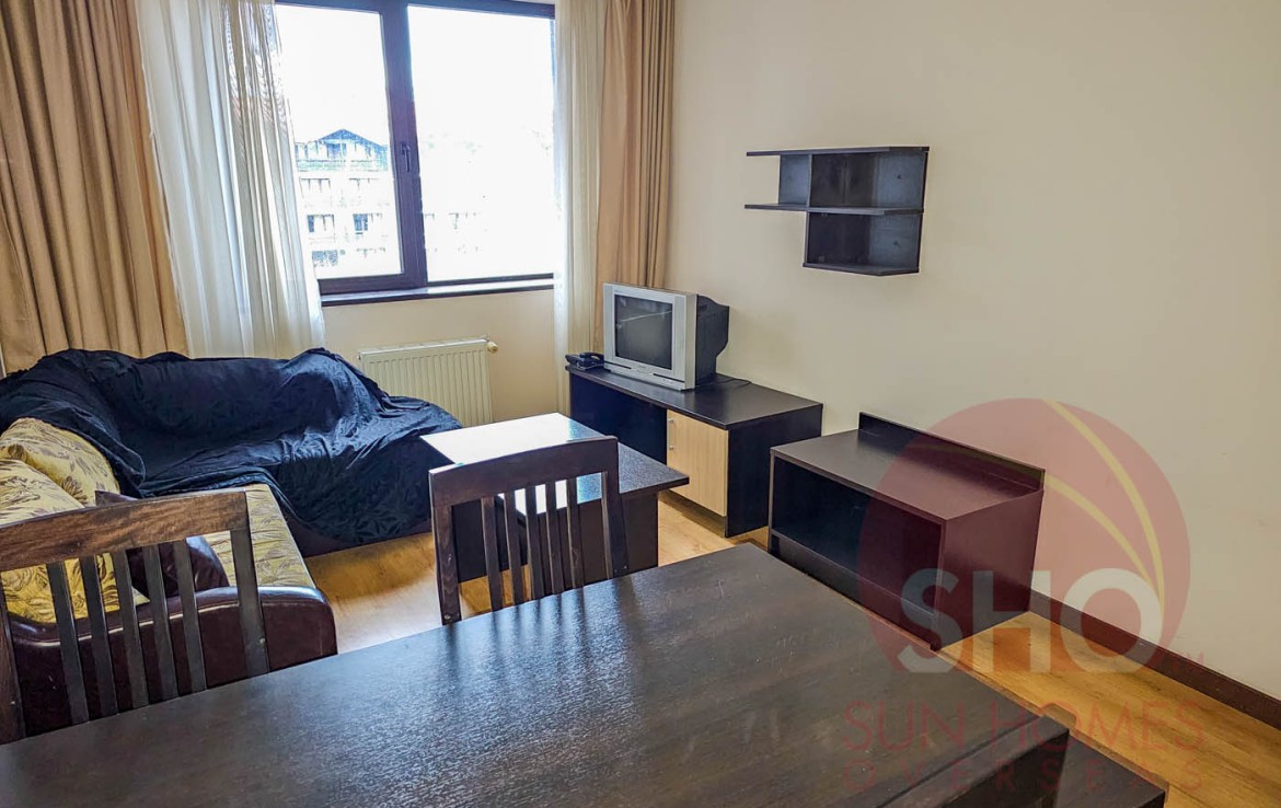 Viewing is recommended of this 3rd floor 1 bedroom apartment which is to be sold furnished. The property consists of an entrance, fully tiled bathroom with shower cabin, fully equipped kitchen with white goods, dining table / chairs, lounge area with sofabed/ TV/storage units, bedroom with bed / wardrobe/ storage cabinets and patio door leading onto the balcony which faces east and has views to the mountains.
