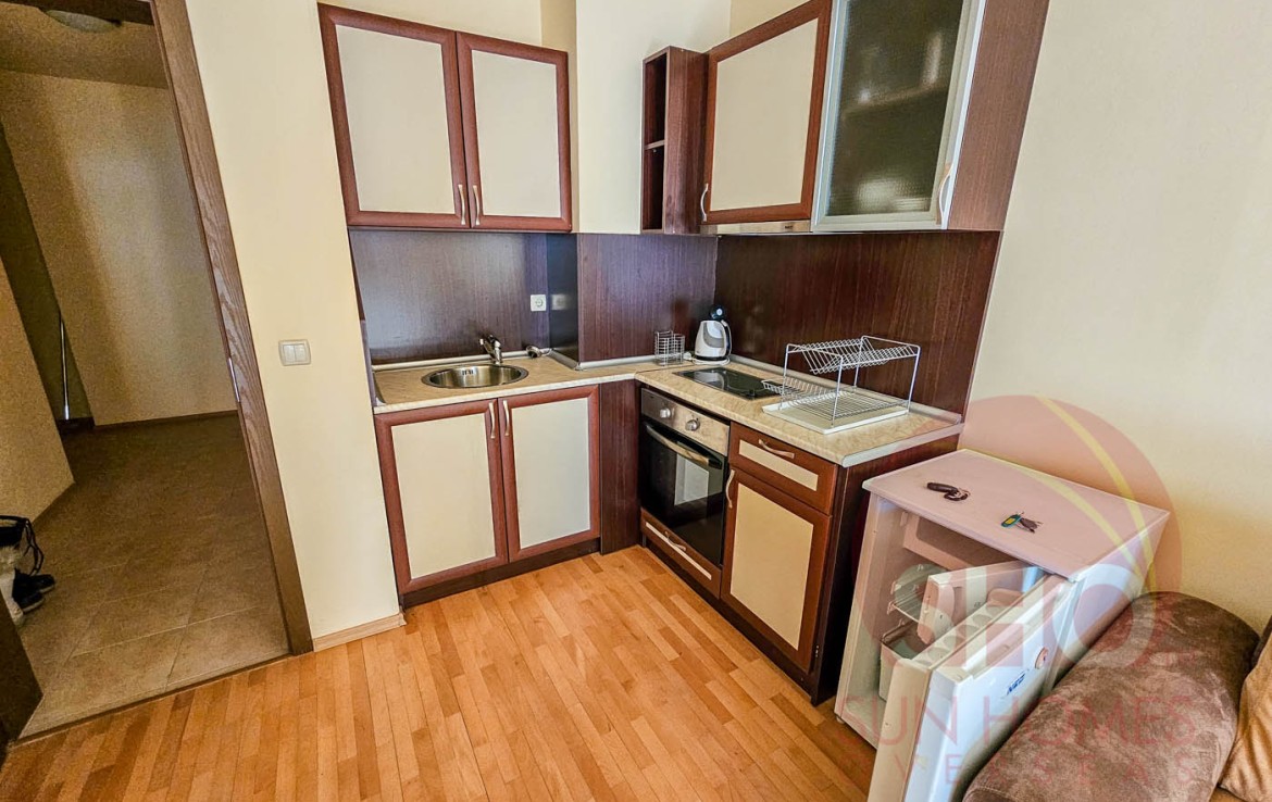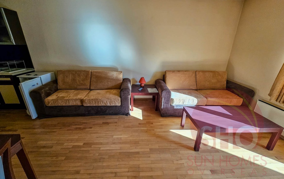 Viewing is recommended of this 2nd floor studio apartment which is to be sold furnished. The property consists of a huge entrance hall, fully tiled bathroom with shower cabin, fully equipped kitchen with all white goods, dining table / chairs, lounge area with 2 sofa beds/TV/ wardrobe / storage units. Patio door opens from the lounge onto the spacious balcony which has South facing views over the garden area and mountains.