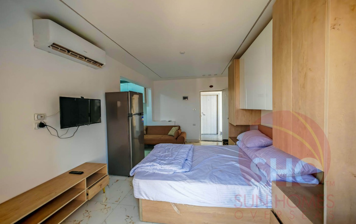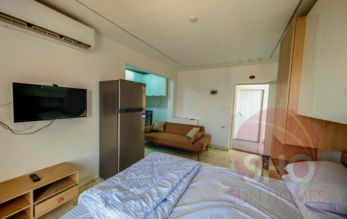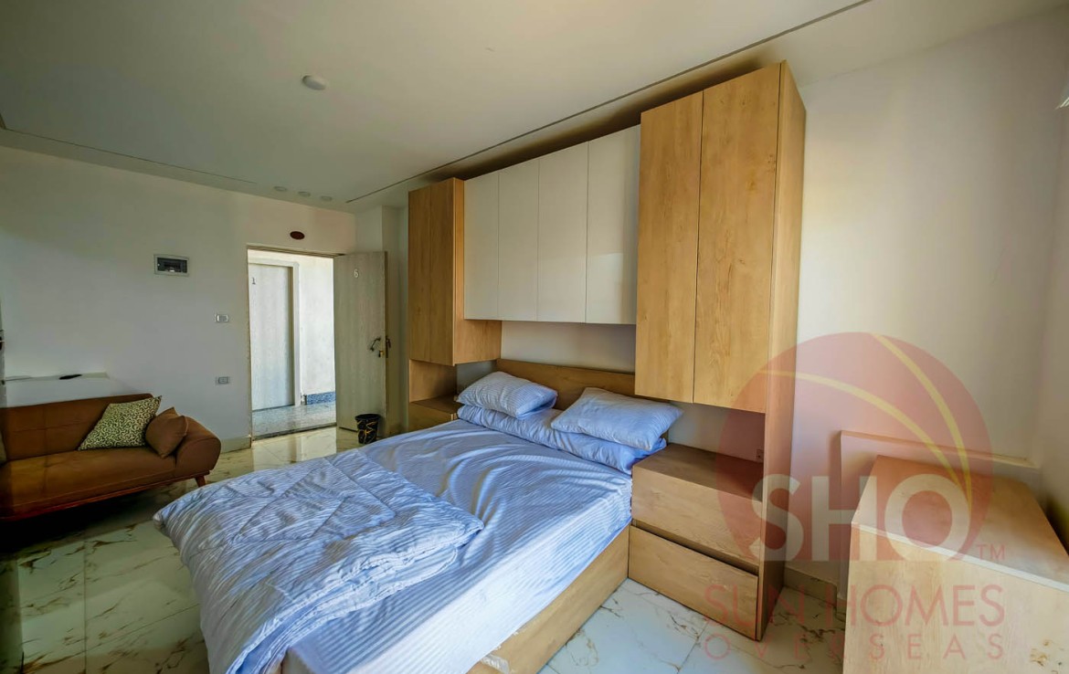 Offered for sale is this newly finished beach-front studio with wonderful sea views. Completed recently, this property is on Balkan Beach Resort which enjoys its own private beach and lovely swimming pool on the beach. The studio features an open plan kitchen/living/bedroom area, custom wardrobes and bed, TV unit and Sofa Bed. The kitchen is furnished with gloss units and marble worktops. The highlight of this property is the stunning panoramic sea and beach view.