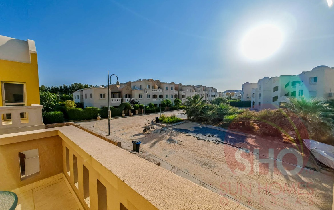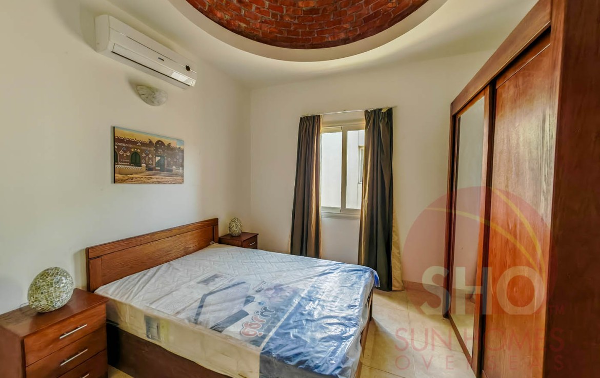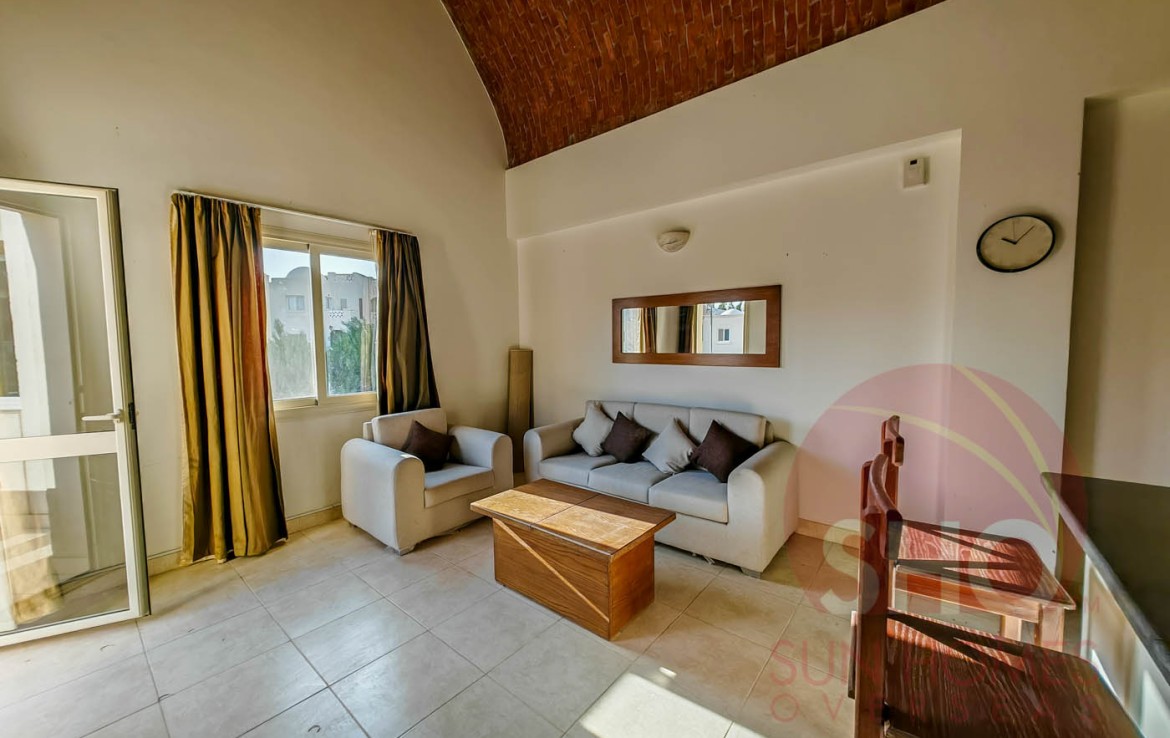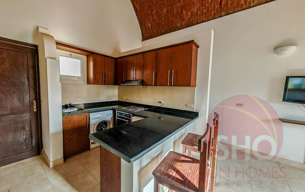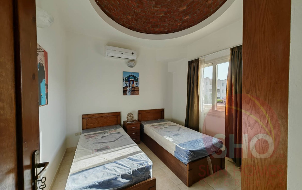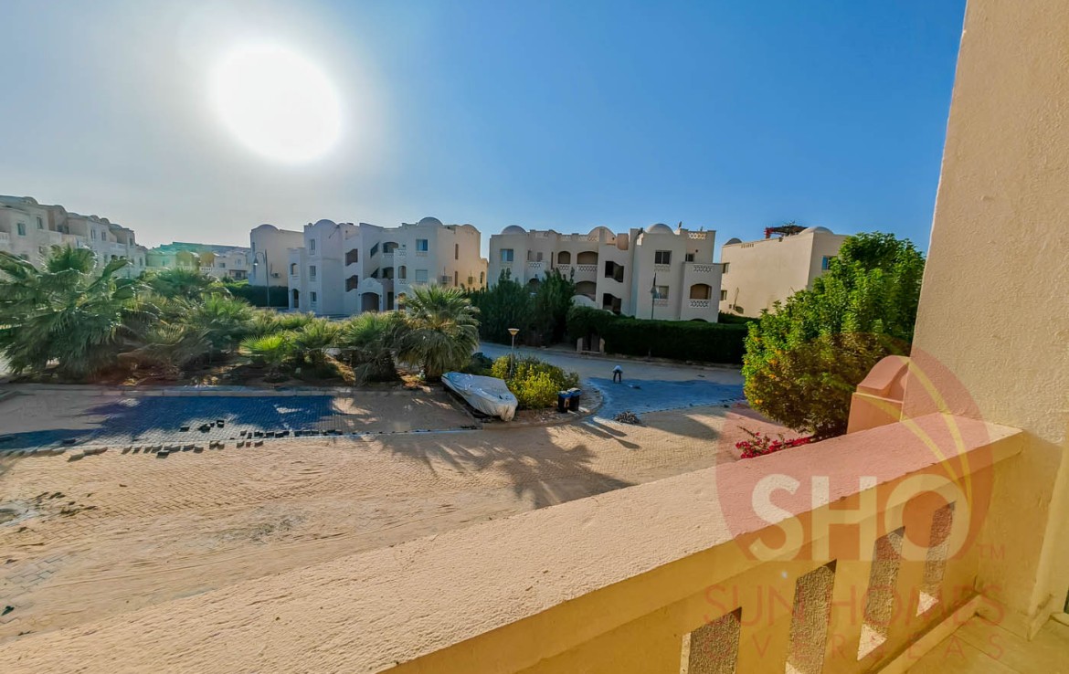 Presenting for sale a decent top floor, T7 (70m2) 2 bedroom apartment in Makadi heights, Phase 1, Q3. This property is sold fully furnished and comprises an open plan kitchen/living area, with solid wood kitchen units, marble worktops, built in oven & hob, under counter fridge and washing machine. The living room opens onto a spacious balcony with a very calm garden view with no immediate buildings in your outlook. There are 2 bedrooms, both of which are furnished with solid wood furniture and wardrobes. The bathroom is fully tiled with toilet, sink and shower.