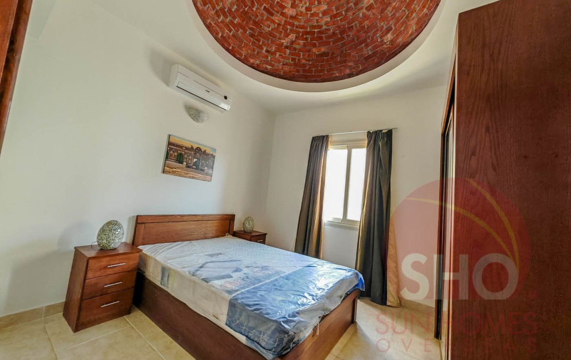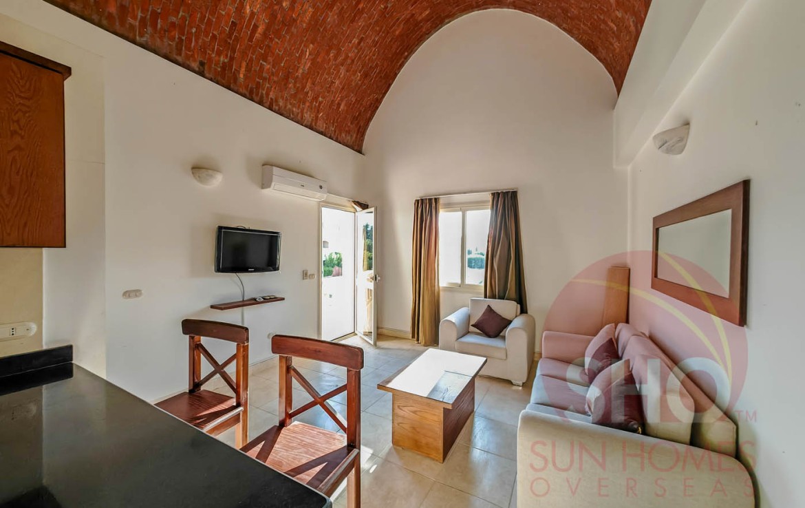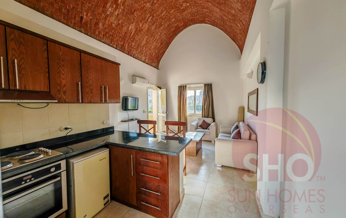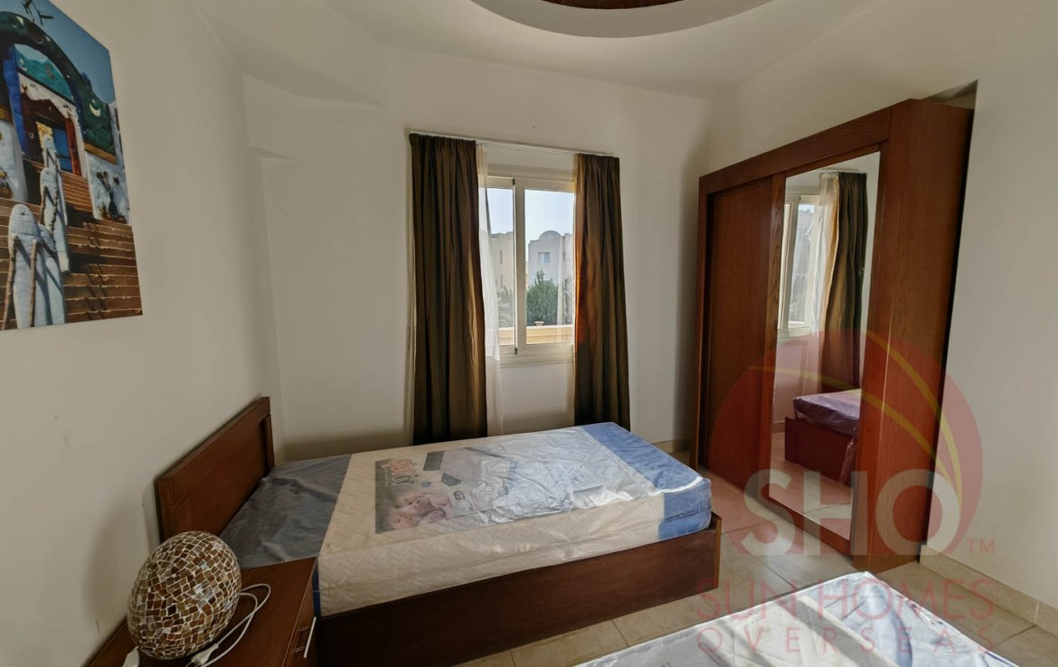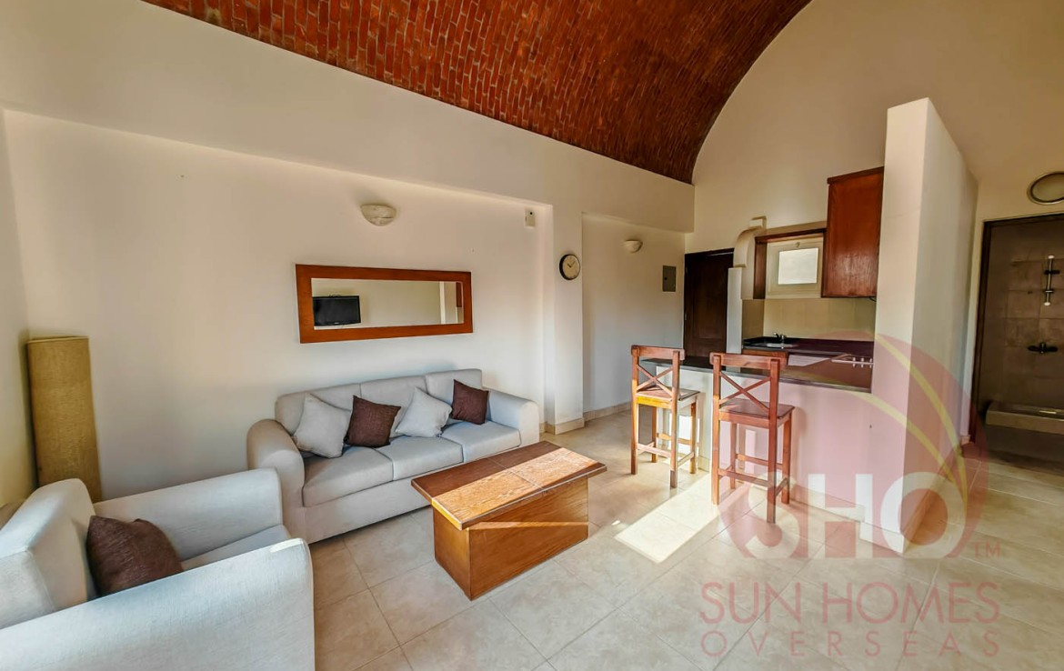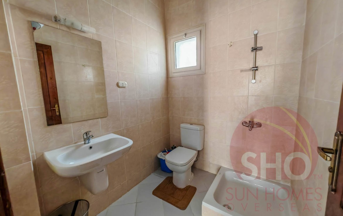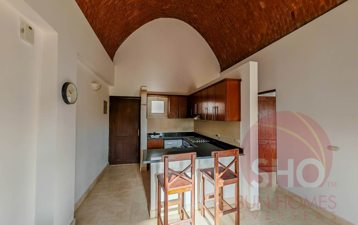 Presenting for sale a decent top floor, T7 (70m2) 2 bedroom apartment in Makadi heights, Phase 1, Q3. This property is sold fully furnished and comprises an open plan kitchen/living area, with solid wood kitchen units, marble worktops, built in oven & hob, under counter fridge and washing machine. The living room opens onto a spacious balcony with a very calm garden view with no immediate buildings in your outlook. There are 2 bedrooms, both of which are furnished with solid wood furniture and wardrobes. The bathroom is fully tiled with toilet, sink and shower.
