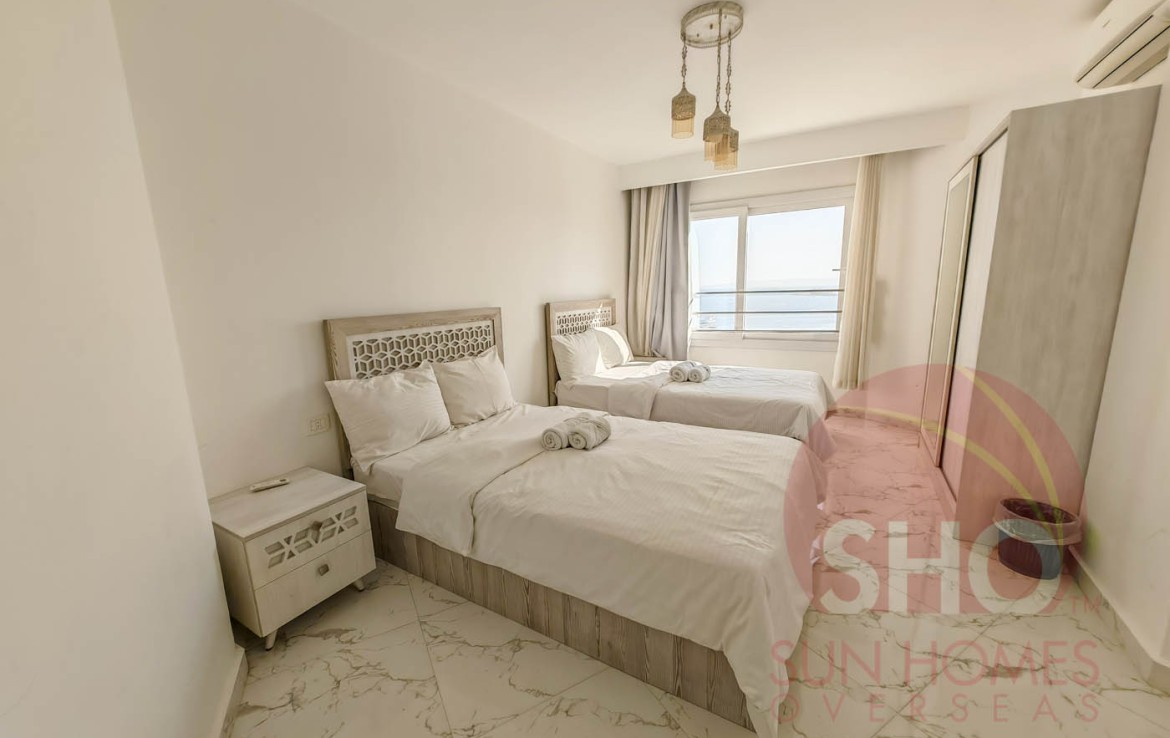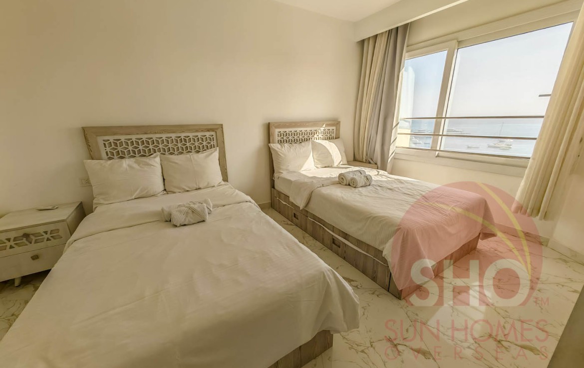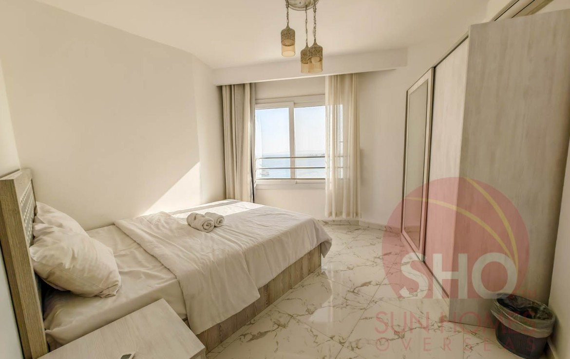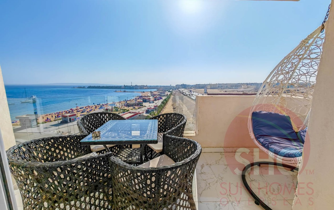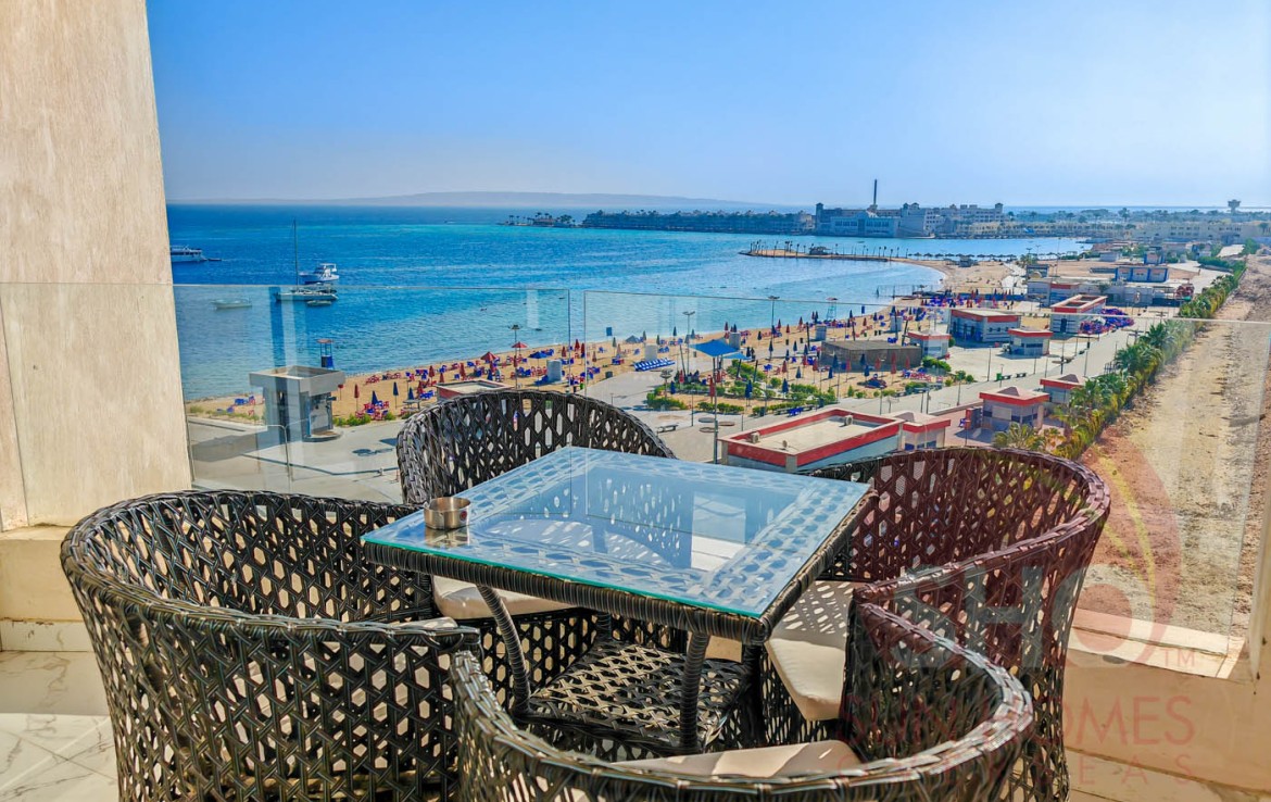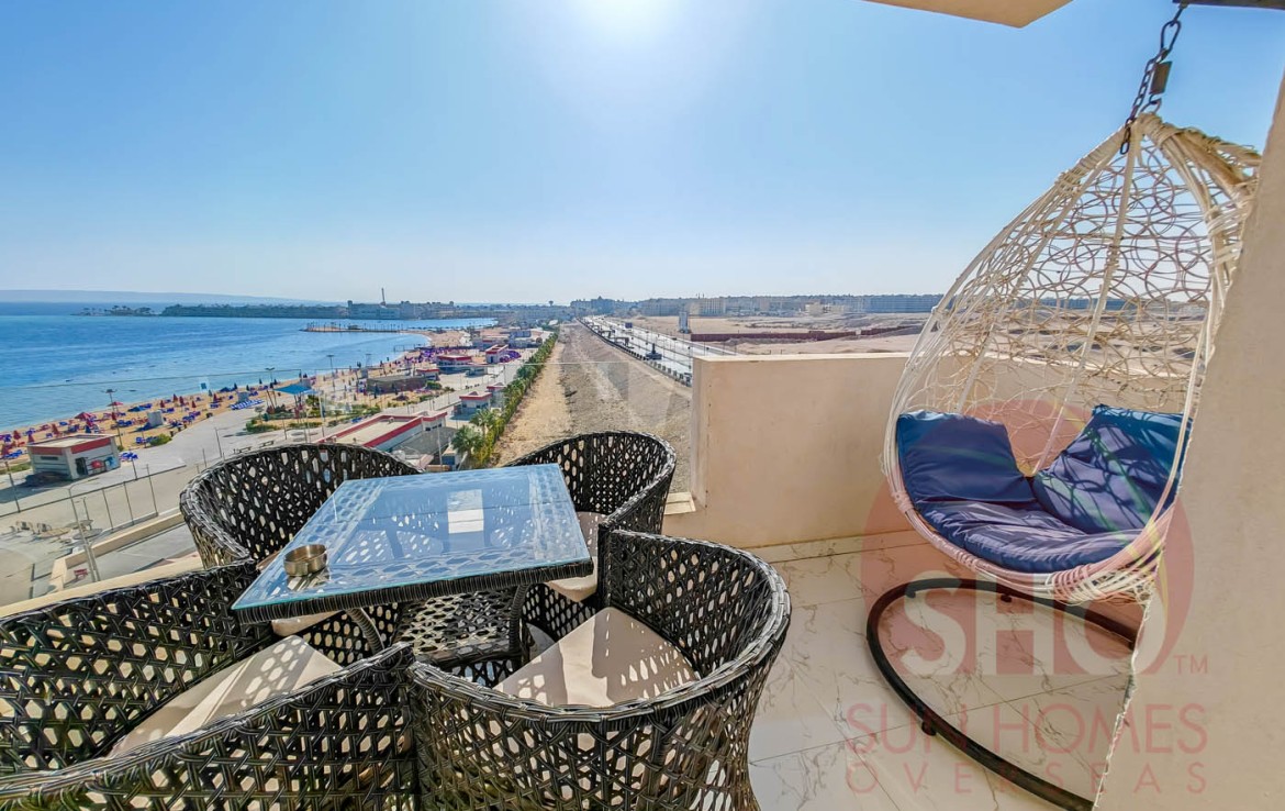 Presenting for a stunning luxuriously furnished top floor central Hurghada apartment with stunning panoramic sea and beach views. This beautiful property has been decorated to a superb standard and very high quality fixtures and fittings throughout. Offering some of the most amazing and guaranteed sea views, this property benefits from an open plan living kitchen area with quality kitchen units, storage and living area with a glass balcony offering stunning views. There are 2 double bedrooms, both of which face the sea, and a spacious tiled bathroom with shower, sink and toilet. Sold with the furniture and air conditioning included, this property makes an ideal holiday home or rental investment.